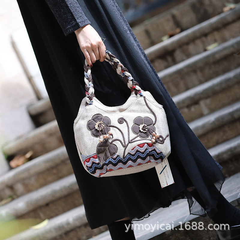 Lightweight and durable handwoven tote bag made from a cotton-linen blend. Features multiple compartments and a unique ethnic design, perfect for daily carrying with both style and practicality.