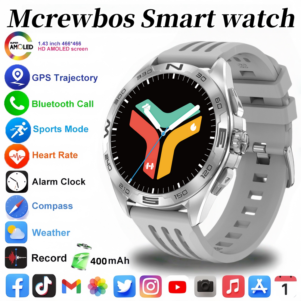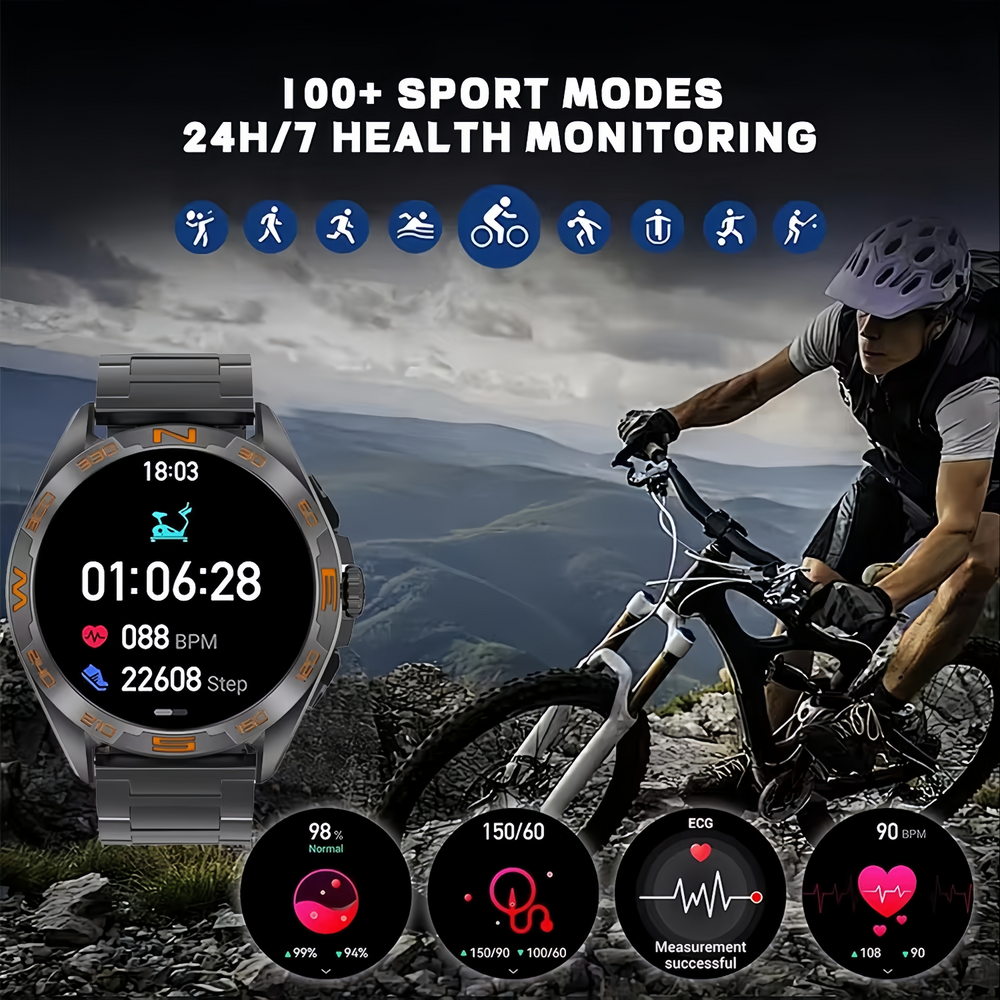 Rugged outdoor smart watch designed for men, featuring waterproof construction, built-in GPS mapping and route tracking. Supports Bluetooth calling and multiple sport modes, ideal for hiking, running, cycling, and everyday outdoor use.